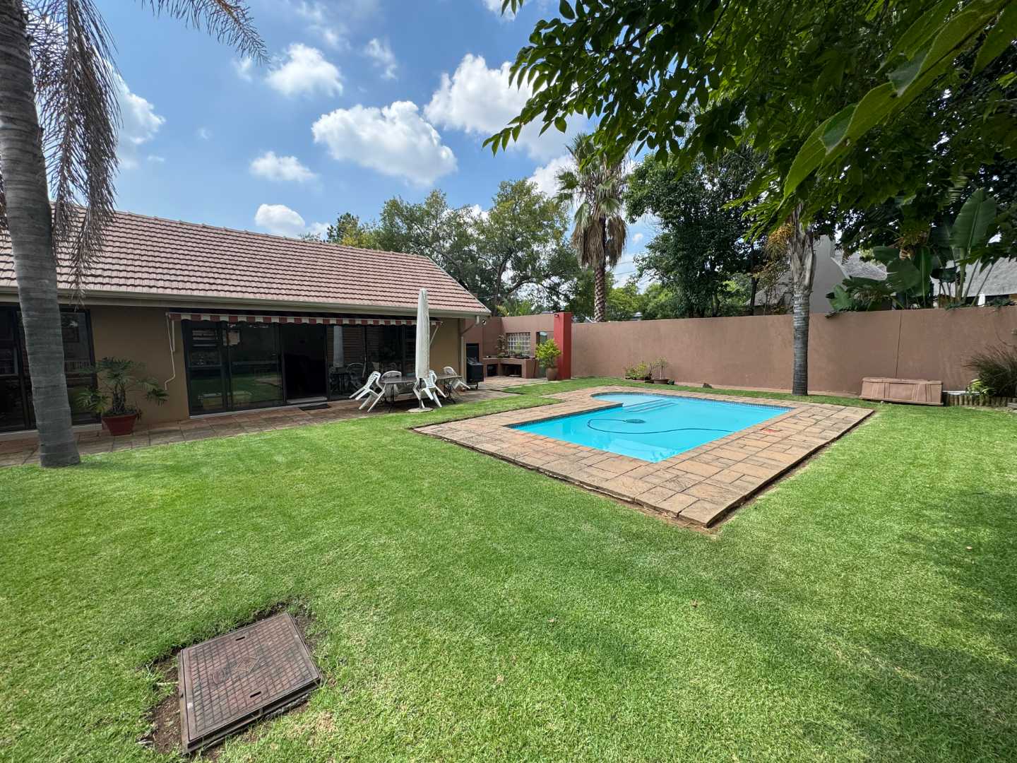 Sliding doors open to the expansive luscious Garden (large grassed areas) with a Pool and Patio (with drop-down sun cover)
