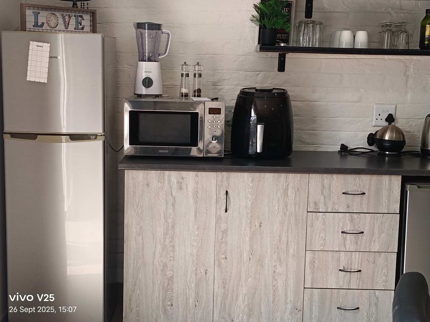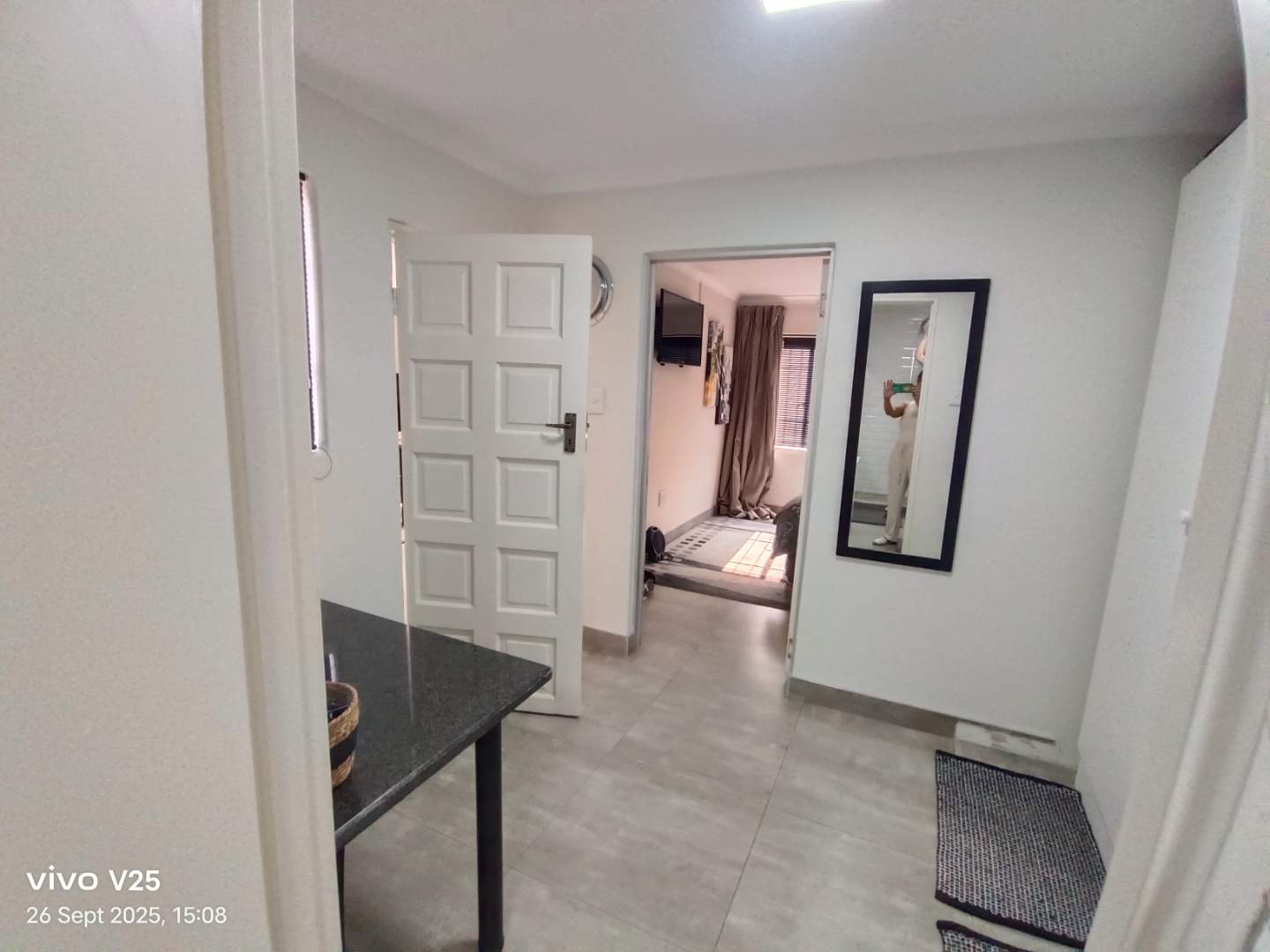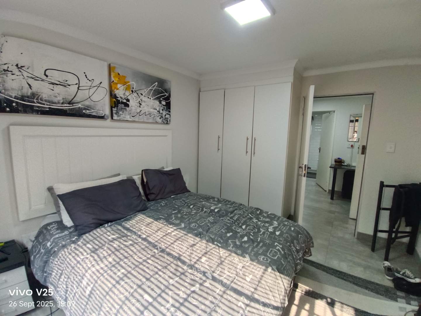 This property includes a generous one-bedroom flatlet, perfect for extended family or rental income. It features an expansive open-plan lounge, dining room, and kitchen area with tiled flooring and sliding doors that lead to the garden. The large bedroom includes built-in cupboards, while the modern bathroom offers a double shower, basin, and toilet.