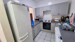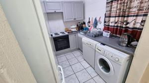 Open plan lounge / dining area, neat kitchen, space for washing machine and dishwasher.