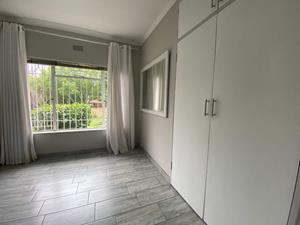 Main bedroom with built-in cupboards, blinds, and a full en-suite bathroom