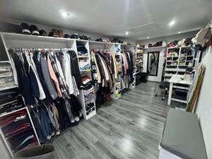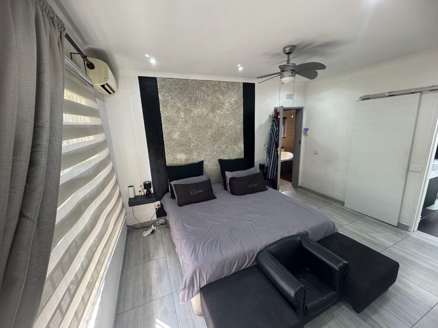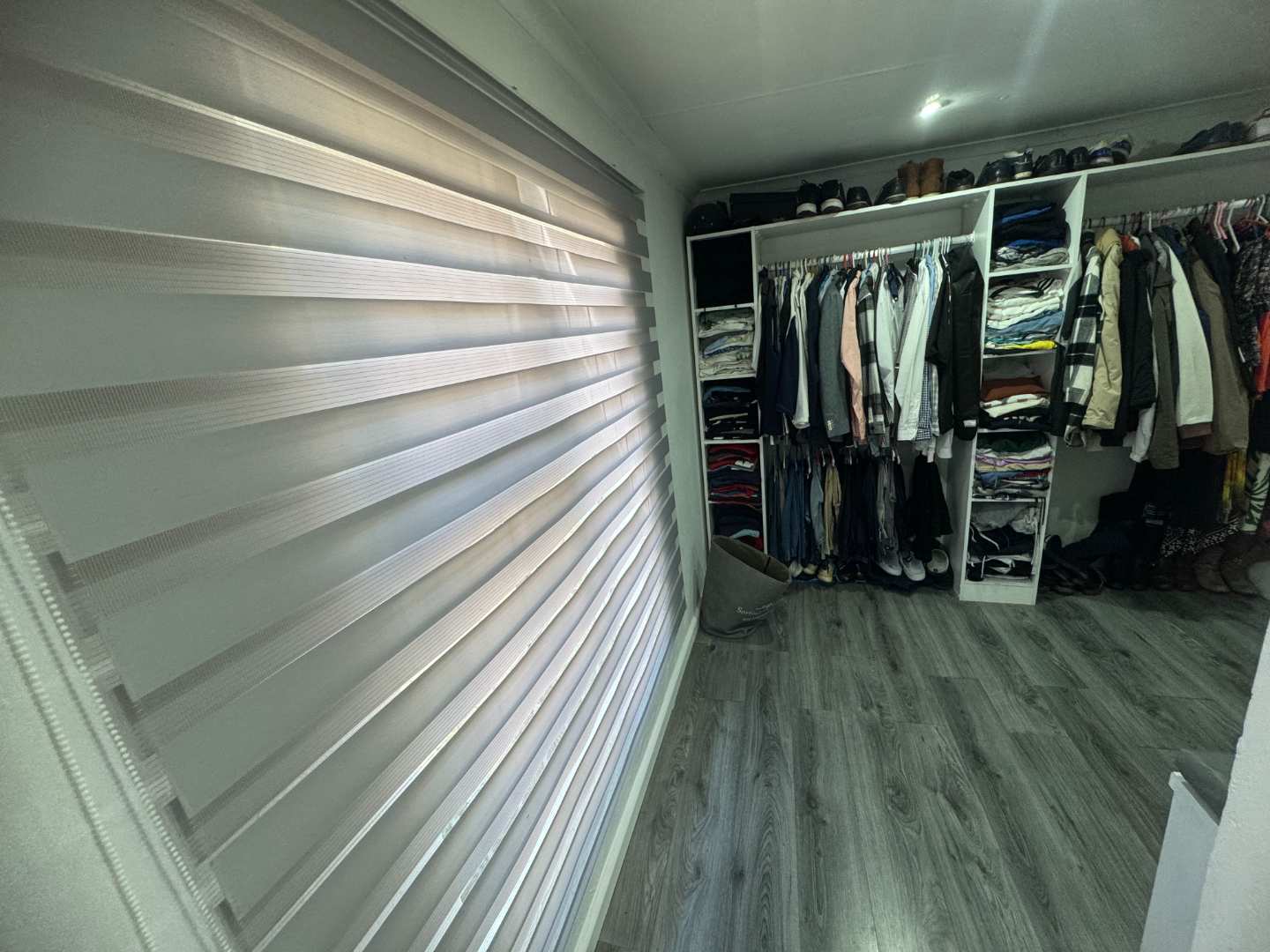 Main en-suite Bedroom features a massive Walk-in Room, blinds, air conditioner, and ceiling fan
