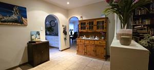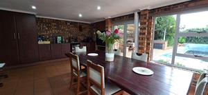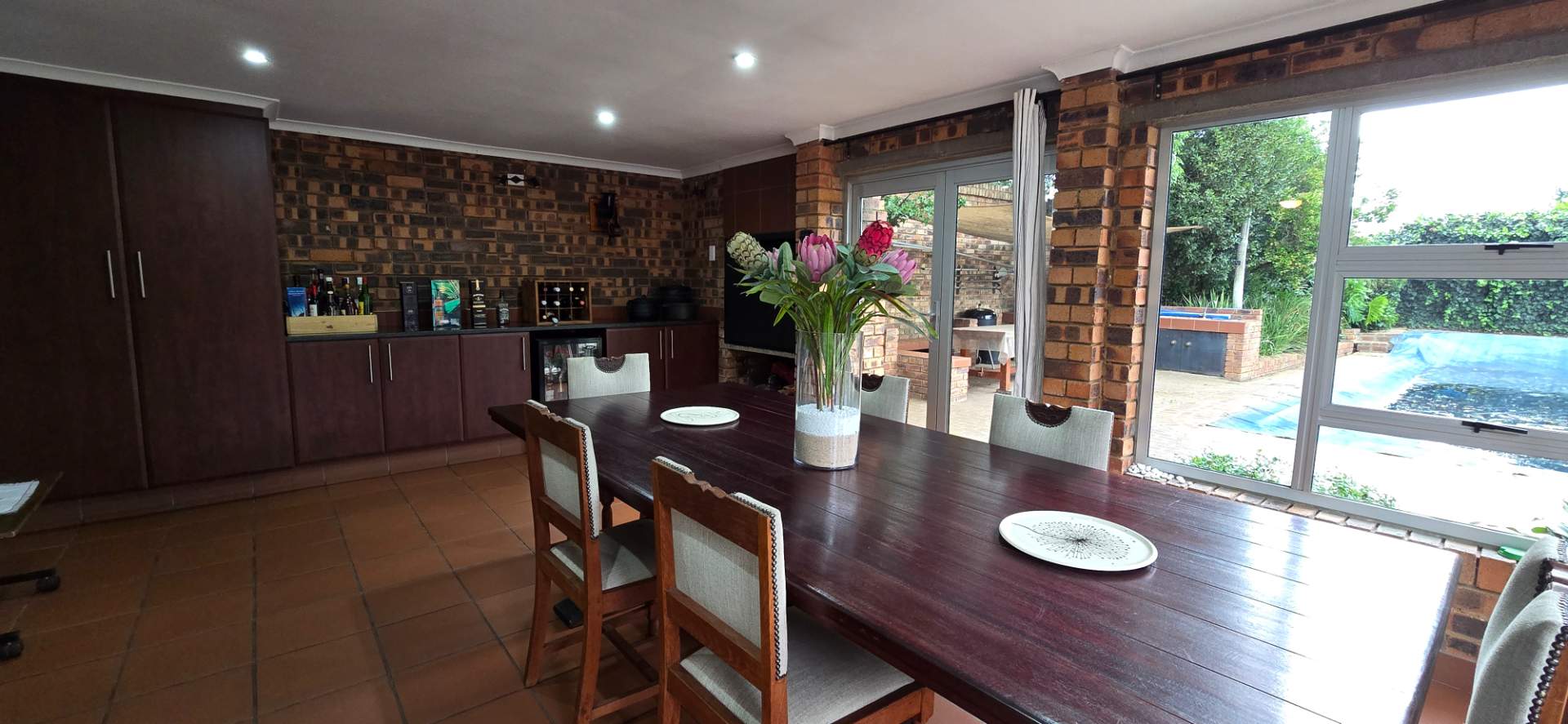 Upon entering step into the welcoming entrance hall, where you will see a private lounge to your right and the kitchen and dining area to your left. The kitchen and large TV room are open plan and has an enclosed entertainment room featuring a built-in braai and stacker doors leading out to the garden.
