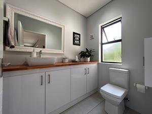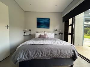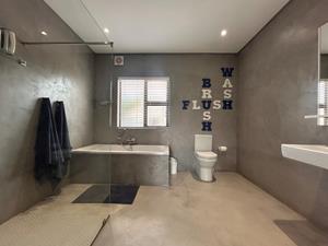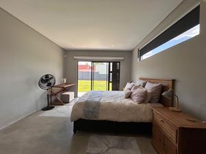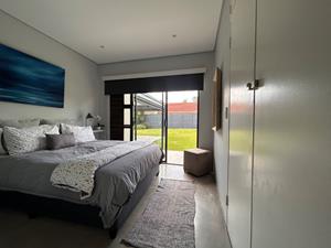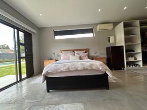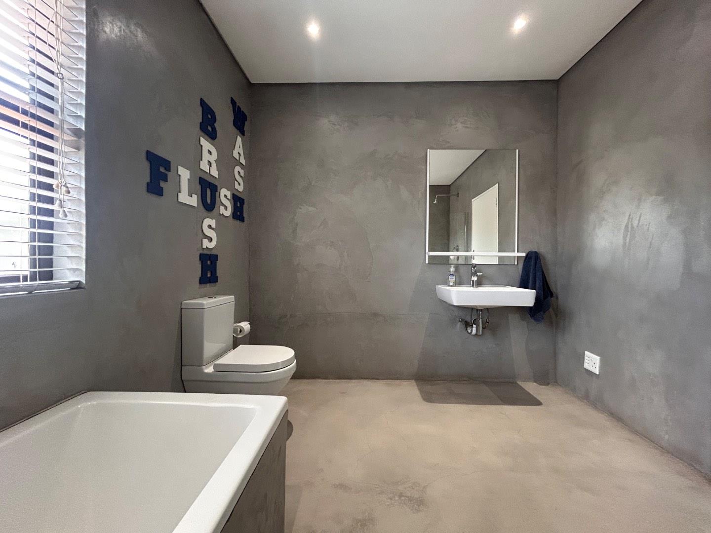 The home offers three beautifully appointed bedrooms, all featuring built-in cupboards, Cemcrete flooring and sliding doors opening directly onto the garden. The main suite is air-conditioned and enjoys a luxurious en-suite bathroom. Two full bathrooms—finished floor-to-ceiling in Cemcrete—are complemented by a separate guest cloakroom, while a dedicated study provides the perfect work-from-home retreat.