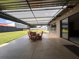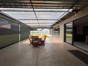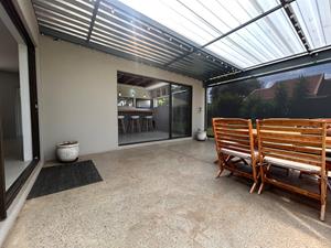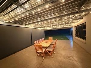 The living space flows seamlessly onto a large covered patio, fitted with drop-down outdoor blinds, allowing for year-round enjoyment while overlooking the garden—an effortless indoor-outdoor lifestyle.