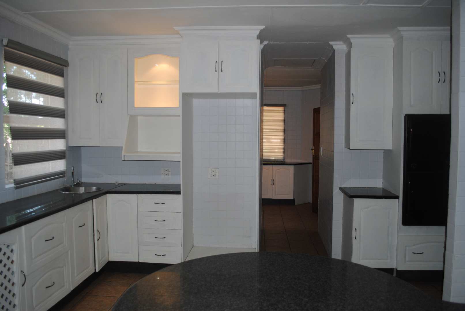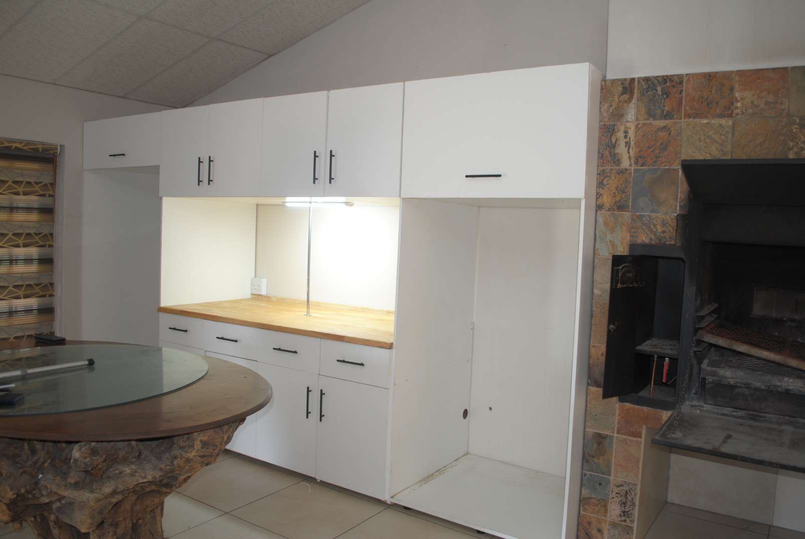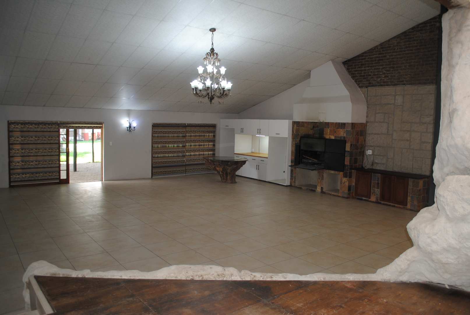Enter a ballroom lounge area with internal braai and newly fitted display cupboards