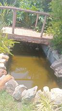 Garden Oasis featuring a sparkling pool, tranquil koi pond, and lush greenery.