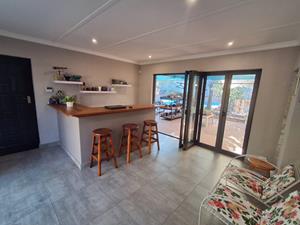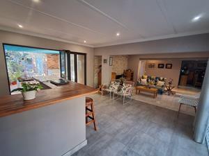 The open-plan living area - from entertainer's lounge, bar area and dining room. The bar area leads out through stacker sliding doors - to a covered patio overlooking the garden and sparkling pool - great design for those entertaining days. There is also a separate formal lounge.