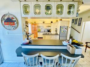 Open-plan kitchen flowing to dining and living area with air conditioner