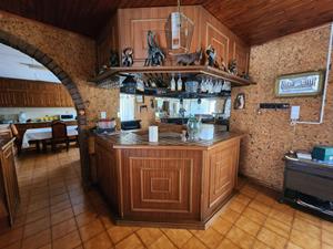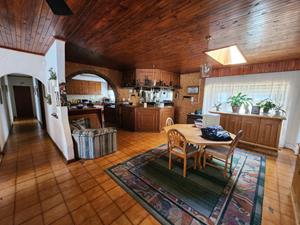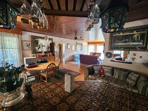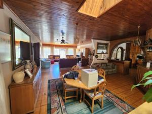 Open-plan lounge and dining areas are drenched in natural light, featuring charming pine ceilings and a built-in bar—perfect for entertaining.