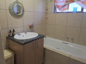 Tiled open plan lounge with a log fireplace and sliders a balcony and built-in braai. Spacious kitchen with space for two machines, a double sink, pantry cupboard and breakfast nook with granite counters.