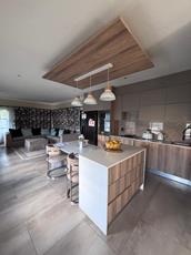 The heart of the home is the open-plan, air-conditioned living area, seamlessly flowing into a modern kitchen fitted with a gas hob, eye-level oven, and built-in microwave—ideal for both everyday living and hosting guests.