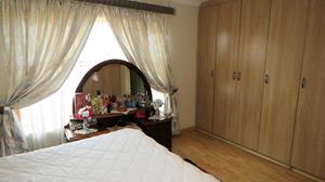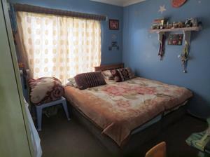 The main bedroom offers laminate floors, ceiling fan, ample cupboards, and a sleek en-suite with bath and shower. A second bedroom also has laminate flooring, while the third is carpeted – ideal as a retreat or home office. The family bathroom includes a bath, shower, and storage, plus a handy linen cupboard in the passage.