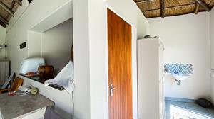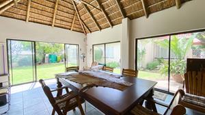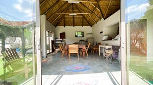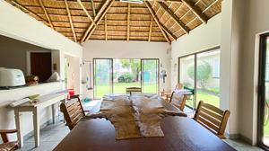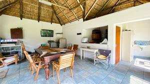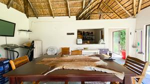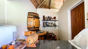 The large thatched entertainment room is ideal for hosting gatherings, equipped with a bar and a pool table/dining table for added enjoyment.