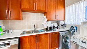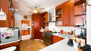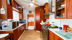 The modern kitchen features solid rosewood cabinetry, Caesar-stone granite tops, a breakfast nook, and a gas stove. A separate scullery provides ample space for your appliances, keeping the main kitchen area clutter-free.