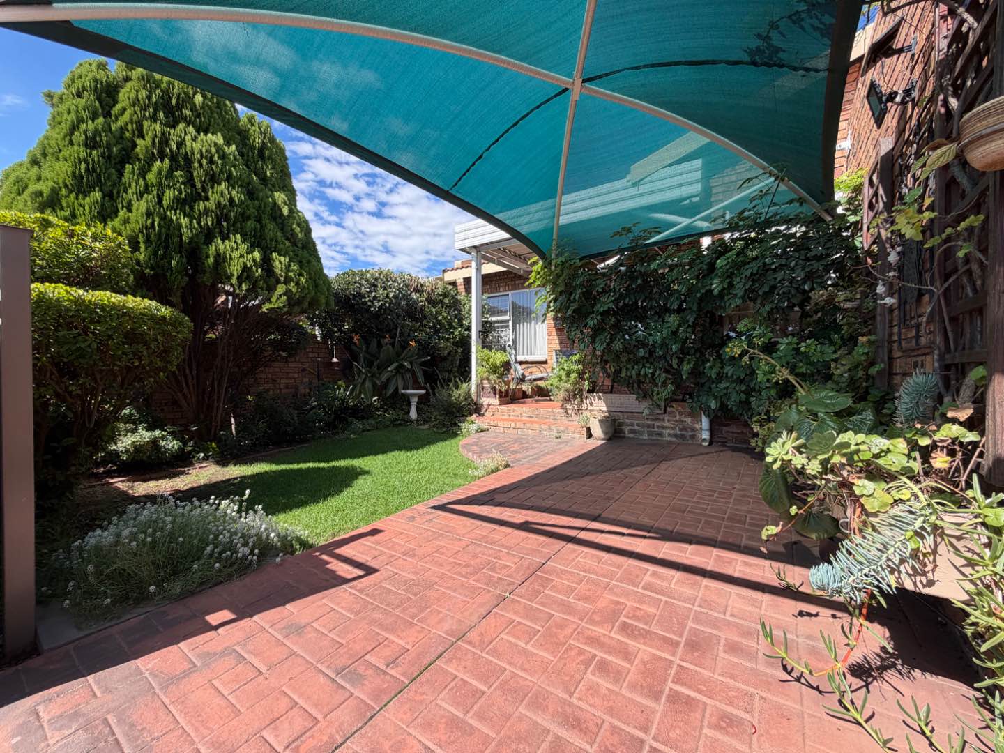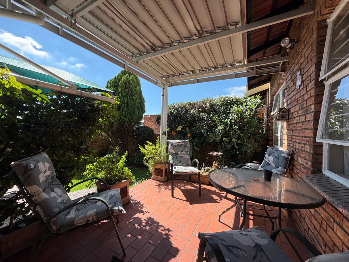 The living area flows seamlessly onto a covered patio, complete with an adjustable louvre awning, allowing you to control light and shade while enjoying views of the beautifully manicured garden—your own tranquil outdoor retreat.