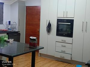 The lounge seamlessly flows through sliders to a lush garden, offering a perfect blend of indoor and outdoor living. The adjacent modern kitchen has granite countertops, an eye-level oven, a gas hob and ample cupboard space. The spacious dining room provides an ideal setting for family meals and entertaining guests.