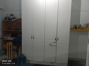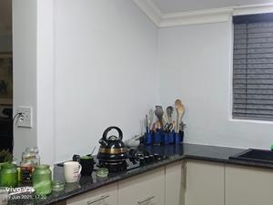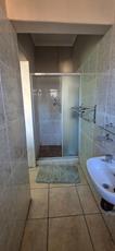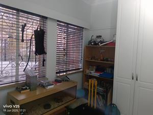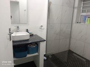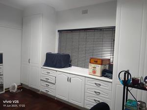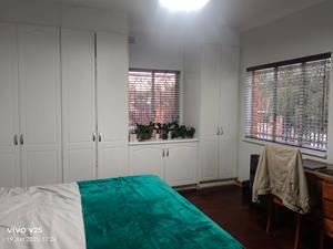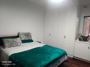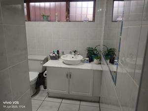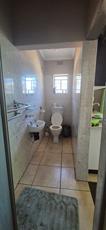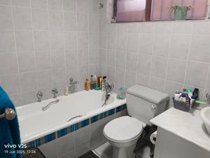 This home features three generously sized bedrooms, each adorned with elegant parquet flooring and ample cupboard space. The master bedroom offers an en-suite bathroom with a bath, toilet, and basin, all kept in pristine condition. A second bathroom in the passage includes a double-sized shower and basin, with a separate toilet for added convenience.