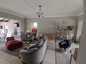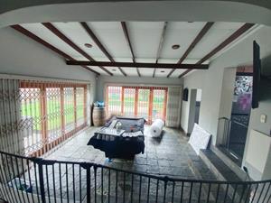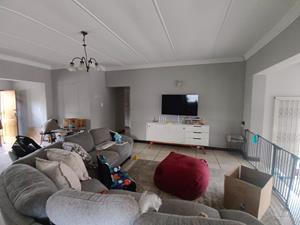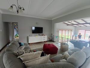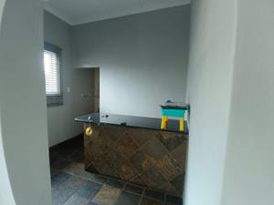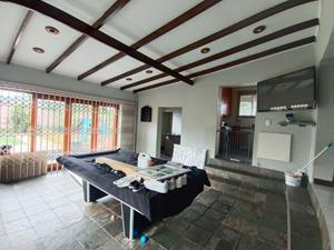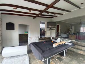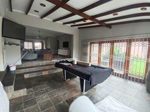 Tiled open plan lounge and dining room with steps leading to a entertainment area with stacker doors that open up to the pool area in the back yard. Next to the entertainment area there is a bar area with a guest toilet.