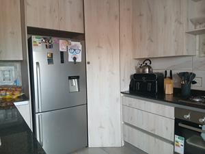Modern kitchen with built-in cupboards, double sink ,electric stove and oven, granite tops, washing machine connections.