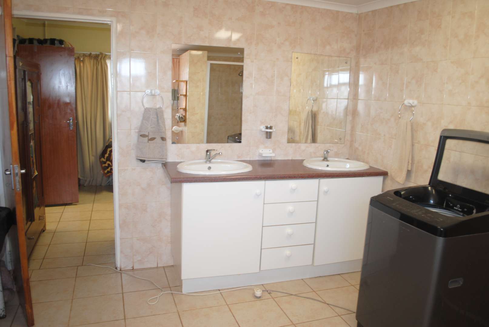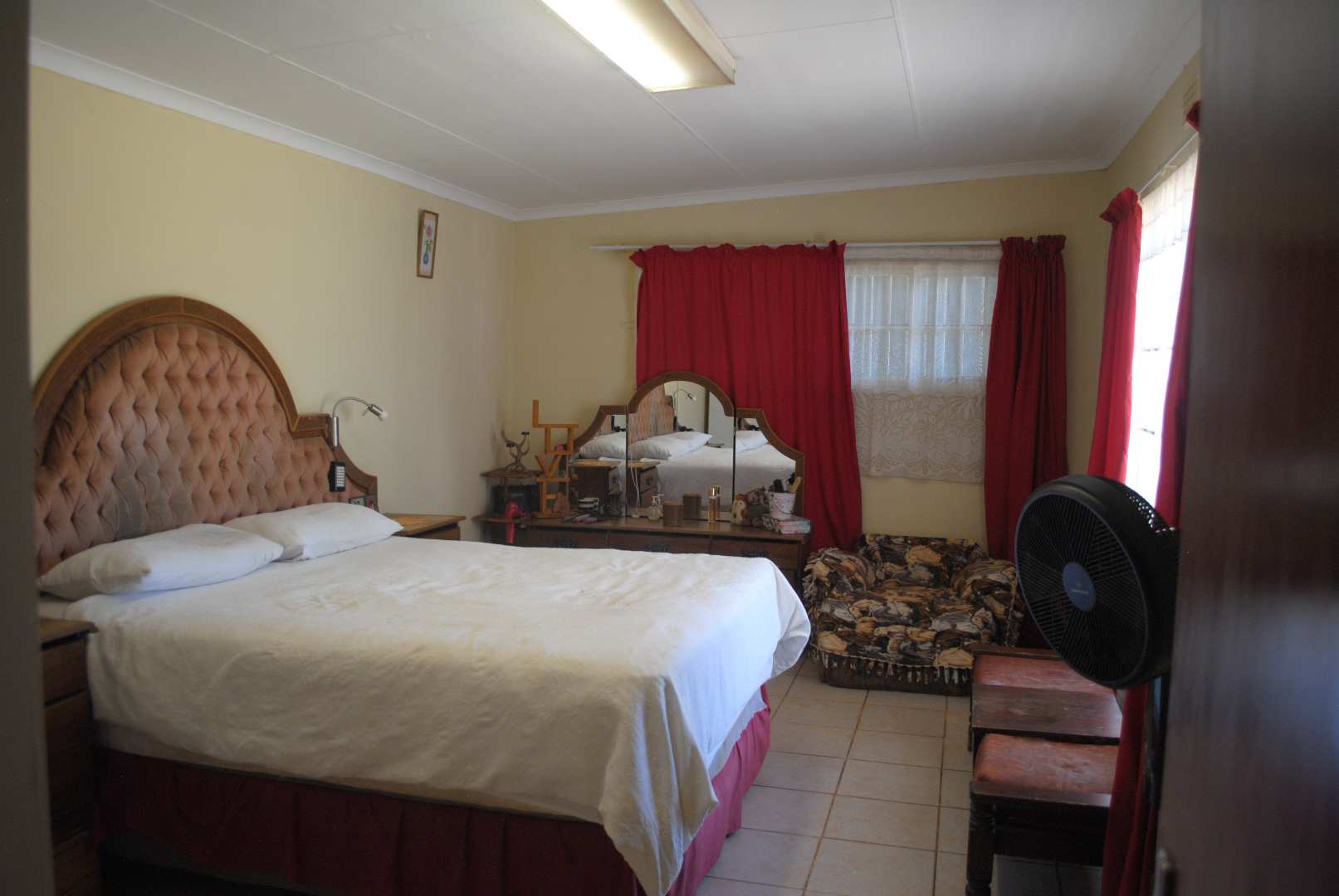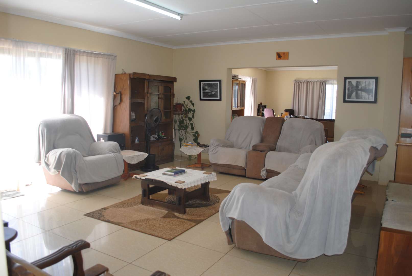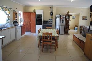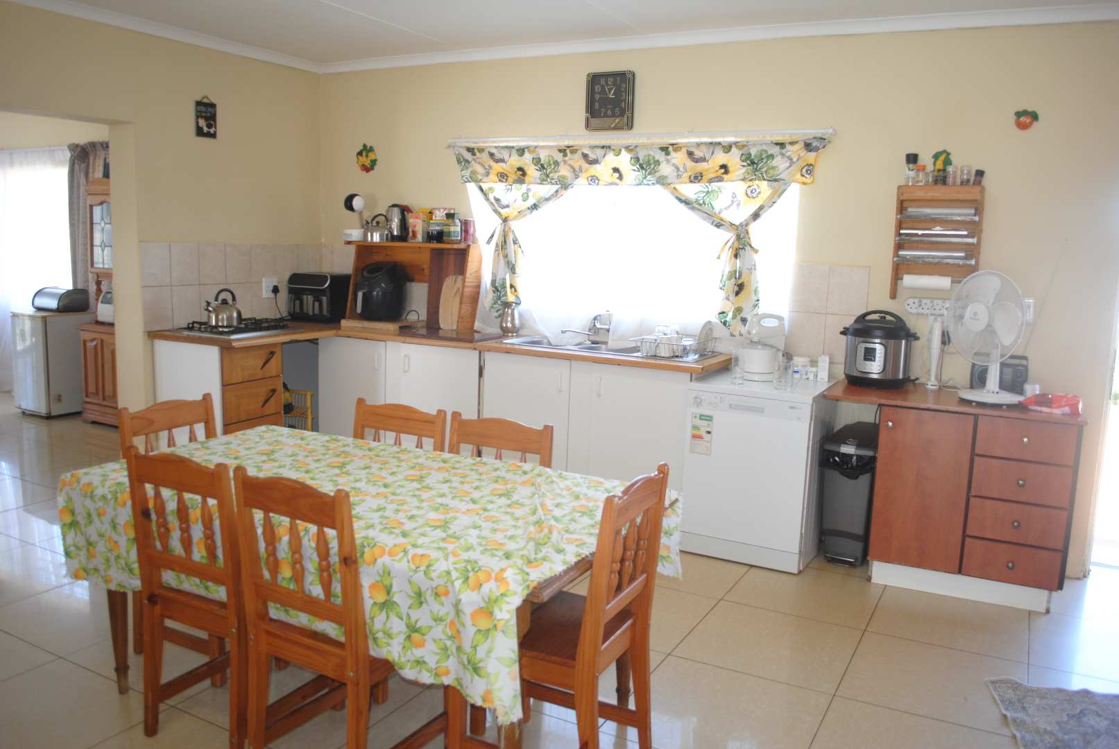 A neat and spacious farmhouse featuring modern interior finishes throughout. The home boasts stylish tiled flooring, a contemporary kitchen with quality finishes, and wide windows that invite in abundant natural light. The layout includes a comfortable lounge, a dedicated dining room, and a second lounge area. The open-plan kitchen seamlessly connects to the living spaces, creating a warm and inviting environment ideal for both family living and entertaining.