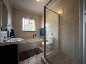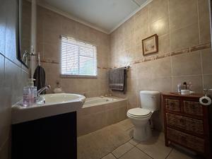 The home features three bedrooms with built-in cupboards and ceiling fans for year-round comfort. Two modern bathrooms – a full family bathroom and a main en-suite (half) – add style and convenience. A linen cupboard in the passage offers extra storage space.
