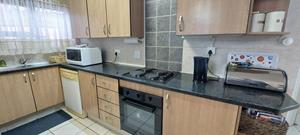 At the heart of the unit is a bright open-plan lounge and modern kitchen, creating a welcoming space for both daily living and relaxed entertaining. The kitchen is fitted with granite countertops, an under-counter oven, electric hob, and space for both a washer and dryer. A breakfast nook adds both charm and functionality, neatly defining the living area.