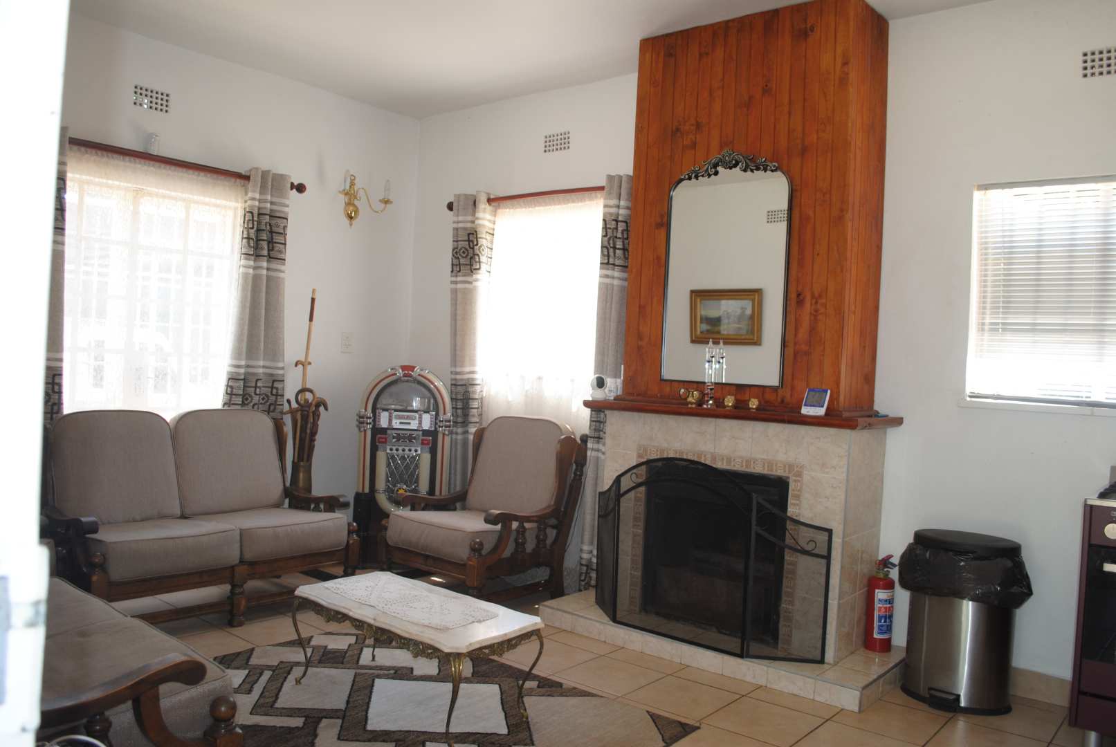 Lounge open plan with fireplace.